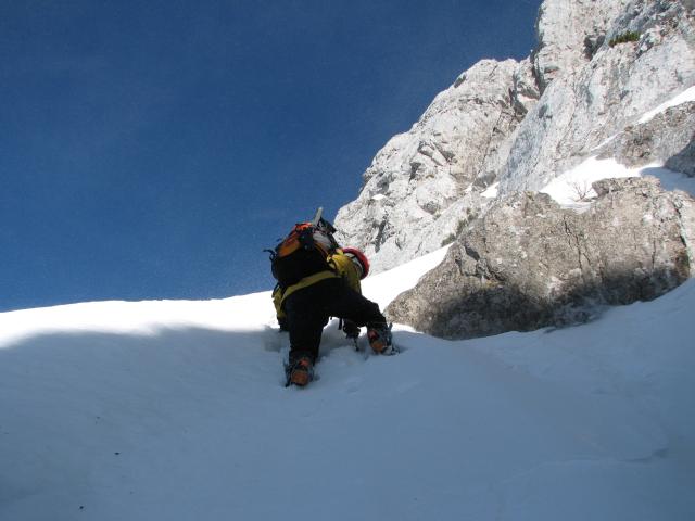 Zdej pa najtežji del: sestop dol v orkanskem vetru preko izpostavljene in sitne prečnice okoli skalnega roba (slike s tega dela ni)