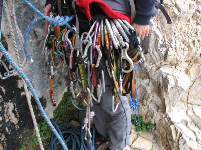 Tole je pa naša roba in lik alpinista. Ja, toliko jo dejansko rabiš. Brez heca. 12 kompletov za tri plezalce za to smer je res premalo.
