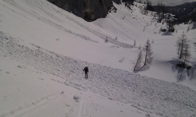 Sneg je bil zaradi visokih temperatur (krepko nad 0) že kar dobro predelan sicer bi bilo prečenje teh plazovitih pobočij bolj tvegano, pa večina pobočja je bila že splazenega.