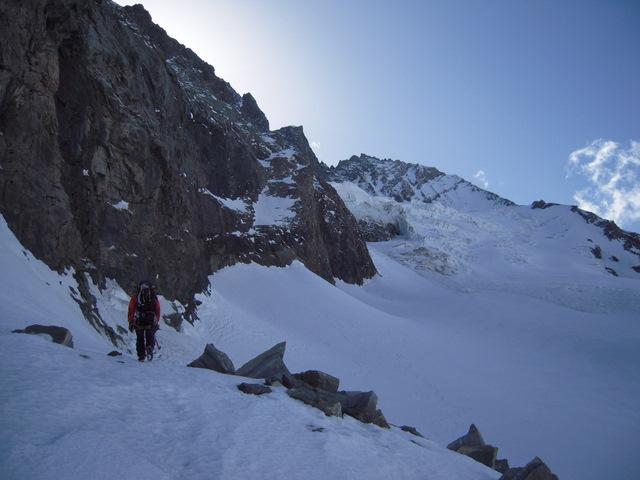 Sva že nad ledenikom, vsaj vdira se ne več toliko. Bivak je na grebenu na sedelcu na desni strani slike.