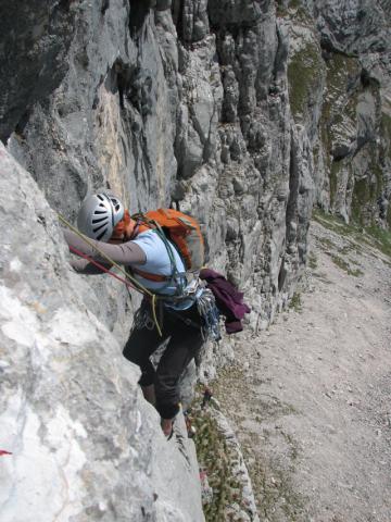 Še vedno 1. raztežaj, vendar nekoliko višje. Sicer plezaš po zahtevni poševni poči proti levi.