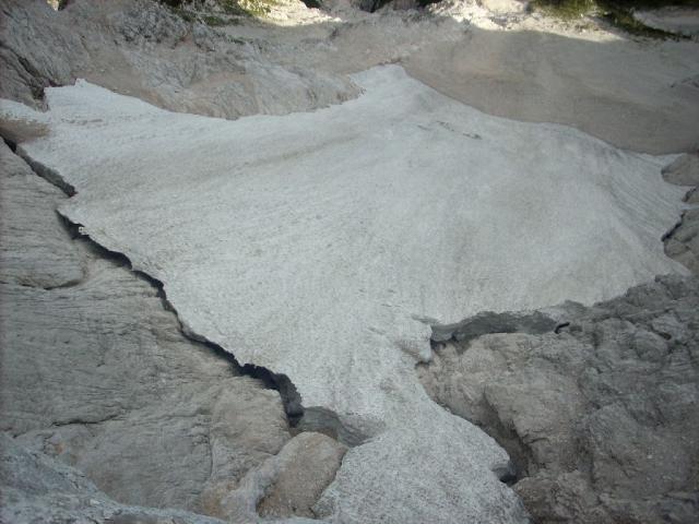Snežišče na dostopu sva obplezala po levi robni zevi gledano navzgor; še hitreje je šlo štajercema preko cik-cak gredin nad nama, počasneje pa kranjčanoma po desni strani ledenika