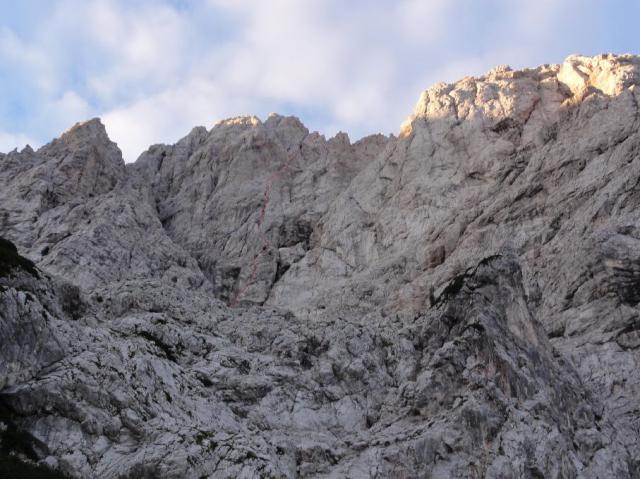 Ostenje Trikota v S steni Dolgega hrbta, smer Trikot v njenem desnem delu gre rahlo poševno v desno