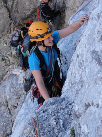 Tanja v zaključni prečki daljšega prvega raztežaja..