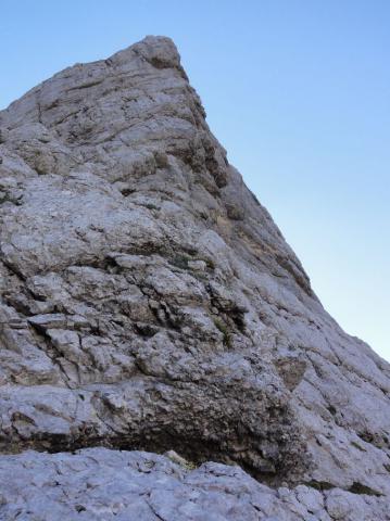 Po nadaljnem lažjem plezanju po "razu" ti pot zapre markantna previsna Ladja!