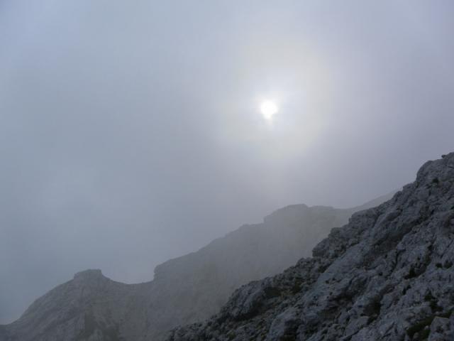 Ko sva začela plezati je bilo še pošteno vroče, sonce pa se je kmalu skrilo za kopreno meglic in se vsake toliko sramežljivo prikazalo.