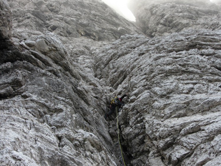 Kamin pri veliki votlini (V+), ki je levo, a je ni na sliki. Tu sva že našle prve kline v smeri. Prvo ključno mesto smeri.