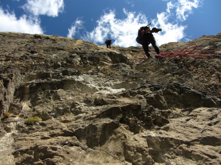Ko tehničarim in ko zlezem čez največji previsni del zagledam še dve kamikazi