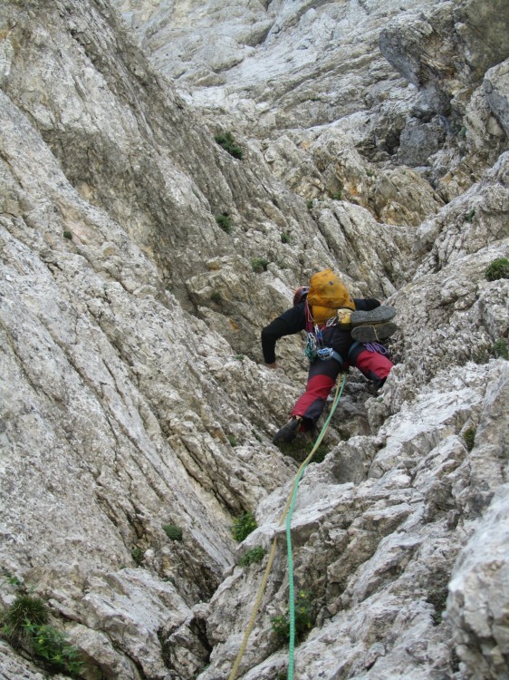 Izstop na polico ki pelje do Bohinjske smeri, potem pa ven na rob stene!