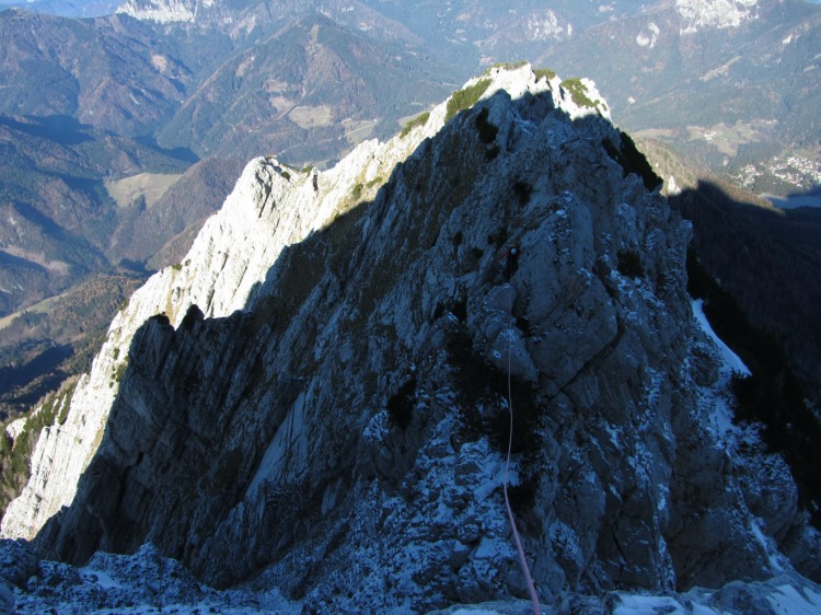 Prvo mesto, kjer sva "vrgla" štrik. Skratka trčiš na velikega žandarja oz. na velik grebenski stolp, ki ti zapira pot naprej. Varovanje zelo, zelo priporočljivo, ker je teren zelo izpostavljen.
