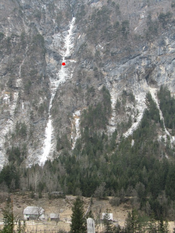 takole je izgledal spodnji del Končarjevega žleba (prvih 250 m), mi smo prišli do rdeče pike.