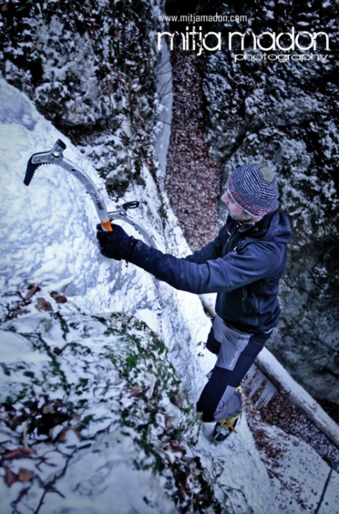 Ledni plezalec s kapo med prvenstvenim vzponom v slapu pod svečo.