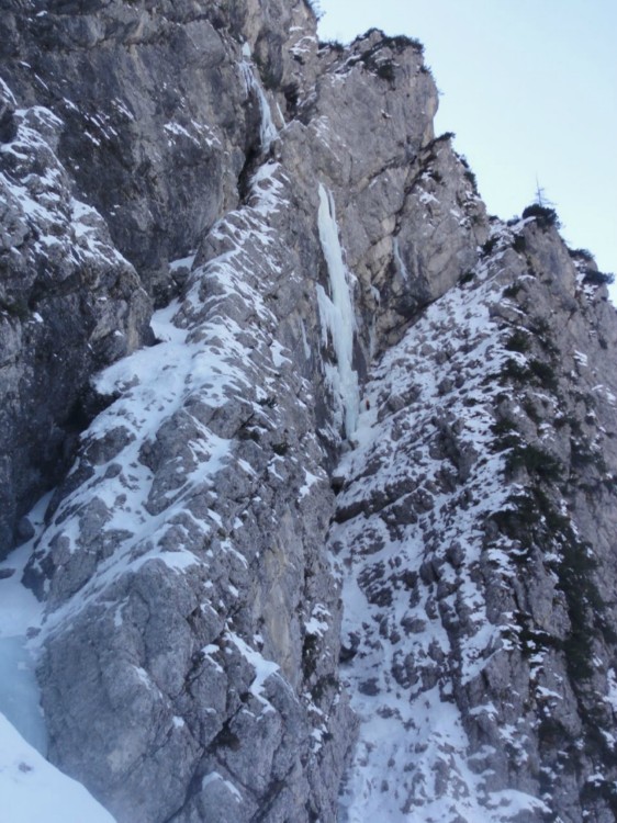 Višje se grapa odpre v krnico, odpre pa se tudi pogled na vršnjo steno - na desni dva napadata visoko in redko narejeno svečo "Položi me nežno"