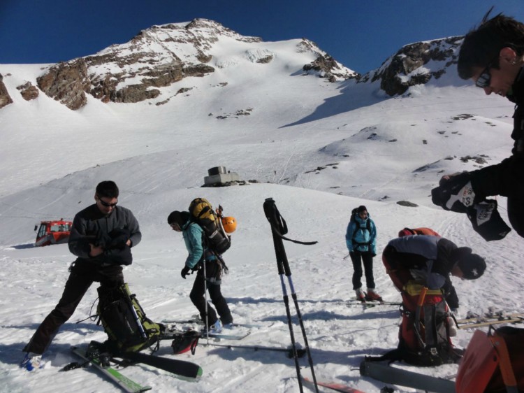 Prespali smo v Gressoney - la Trinite-ju in se v soboto zjutraj z gondolami hitro pregoljufali na 3200 m. V ozadju že današnji cilj Piramide Vincent..