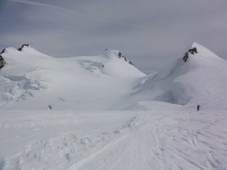 Levo Zumsteinspitze, desno Parrotspitze, v sredini pa naš današnji cilj Signalkuppe (4554 m) z najvišje ležečo zgradbo v Evropi (koča Regina Margherita)
