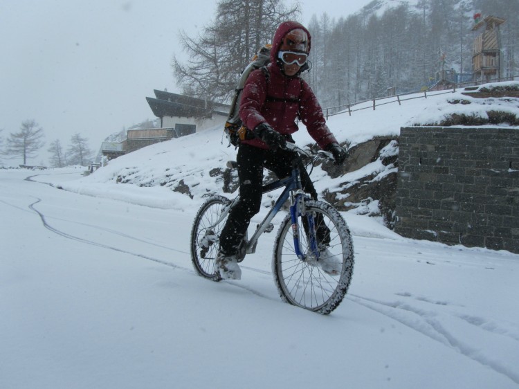 Čakalo pa naju je še eno presenečenje. Spust po zasneženi cesti (skurla sva vse žlajfe).