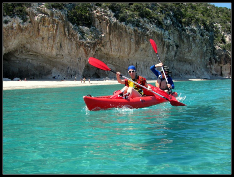 Med nama je še Tris skrit pod rdečim dežnikom - senčnikom. Ni bil preveč navdušen nad kajakom, še manj pa nad skokom v vodo in mu ni ostalo drugega kot sedeti v čolnu kot kup nesreče.