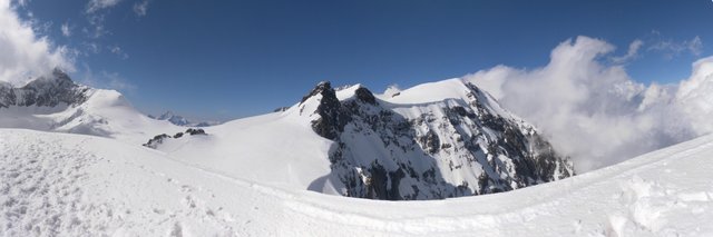 Razgled z vrha Piramide Vincent. Z vrha je zelo lep in enostaven spust s smučmi po odličnem ravno prav odjenjanem snegu. Z nekim Italijanom sva se strinjala, da je to drugi najboljši sneg takoj za pršičem. Uživancija.
