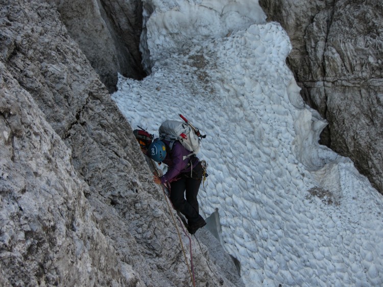 V štartu je plezanje III do III+; mi smo plezali vseskozi v gojzarjih