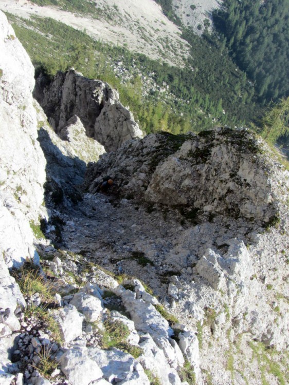 Potem pa še lažje poplezavanje po gruščnatih žlebih in kaminčkih do Dibonove "police". Tam se naveževa in se še nekaj cugov prebijava preko logičnih prehodov (Miheličeva skica nama je služila bolj okvirno), dokler se stena zares ne postavi pokonc.