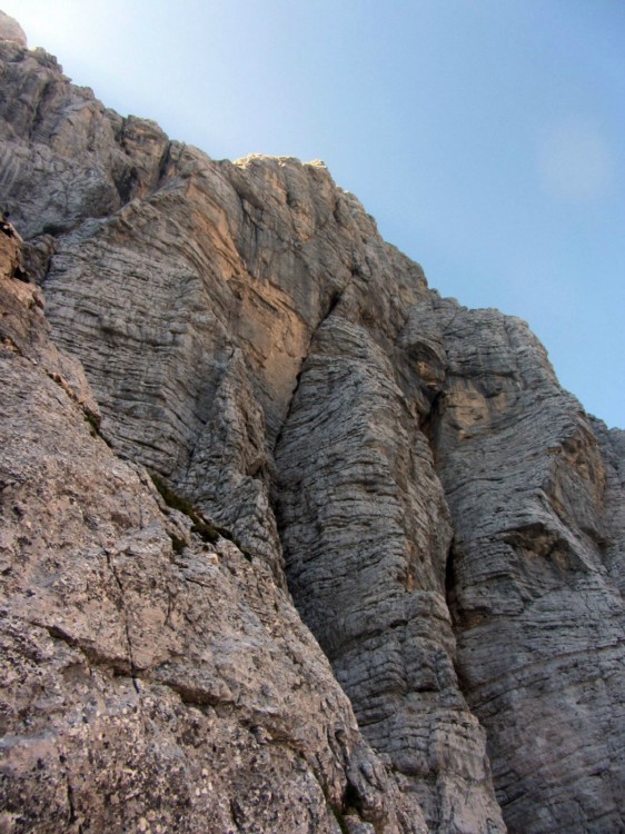 Po več kot 500 m dostopa se ti odpre prepadna vršnja stena. "Čop" gre najprej po srednjem vznožnem stebru, potem pa se pregrize prek štirih votlin in previsov skozi strmi del stene in se pod vrhom v levo priključi Gorenjski smeri po razu.