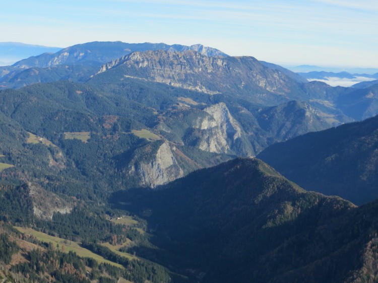 V ozadju greben Olševe, spodaj podobo pokrajine rišejo Peči, kjer radi plezamo.