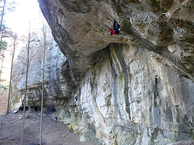 Tulišče Eptingen. Robert Jasper se ogreva v Spidermanu (D13)...Ko smo z Robertom obiskali njegovo trening luknjo, je ta smrdela po gnojnici. V kombinaciji z blatom na tleh in Robertovim virtuoznim plezanjem nad njim, se mi je dobro vtisnila v spomin. Kako domače...