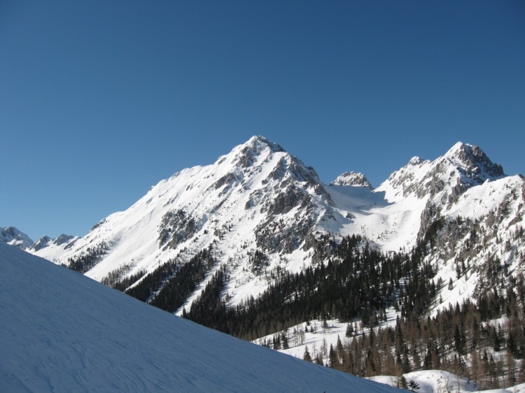 Najprej 20m je bolj pokonc po enmu žlebu, potem pa grebenček od vrha. Na sliki se mogoče vidi na levi strani Zelenjaka ta žleb, kjer je največ snega