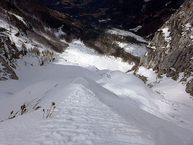 Izpostavljen in strm grebenski prehod sredi spodnjega dela doline. Predsmučnika sta dol štamfala,
