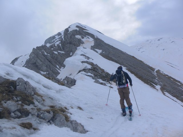 Na skoraj 1900m prideš na sedelce, od koder se že lepo vidi vrh Stola. Do tja pa je že treba sneti smučke za 100m.