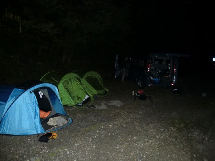 Ob 1h smo ob cesti postavili šotore malo pred Alagno. Še pred alarmom pa nas je zbudil ... dež! Na hitro smo pospravili šotore, se zbasali v kombi in odpeljali proti gondoli. Kaj pa naj, saj mogoče bo pa zgoraj boljše...