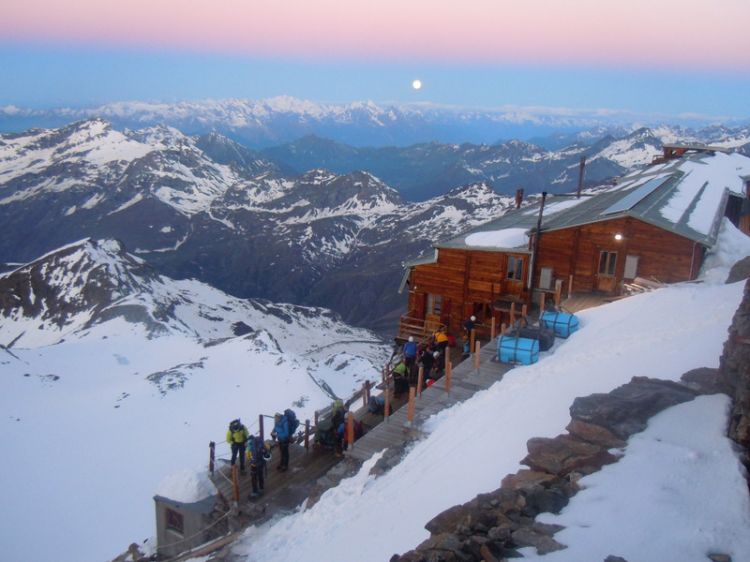 Če se ne bi mudilo na pot, bi lahk tam sedel 1h uro in občudoval sončni vzhod. Ampak plan je bil iti na vrh Signalkuppe, kjer stoji najvišja koča v Evropi na 4,554 m. Matjaža in Sabino je zdelala višina in sta ostala v koči, ostali pa smo šli proti vrhu. Onadva sta imela čisto svojo avanturo.
