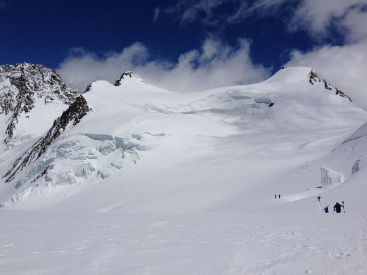 Potem se pa odpre pogled na vrh. Signalkuppe je na desni, levo od njega pa Zumsteinspitze. Punci sta šli na Signalkuppe, midva z Mihatom pa prej še na Zumsteinspitze.