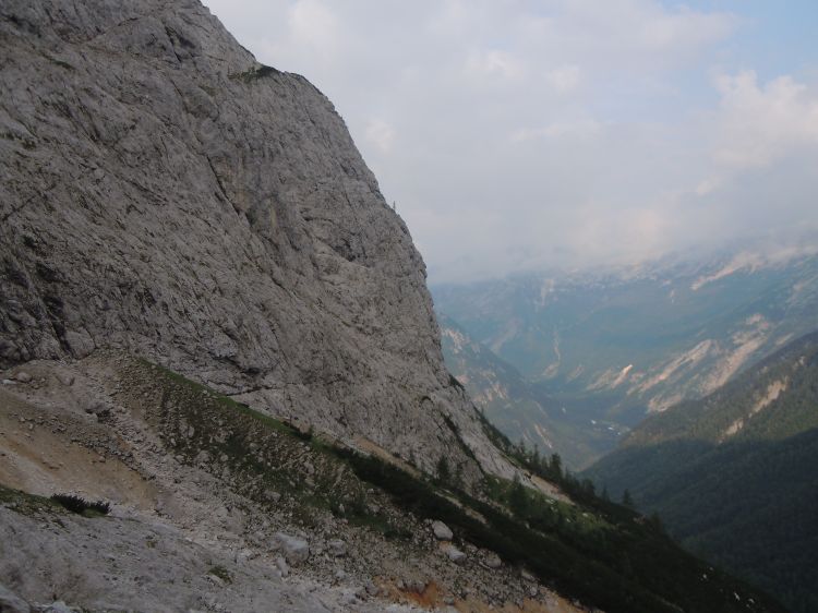 prava smer pristopa pod stenami.Od daleč dobro vidna gredina,ki se dviga proti desni.Dolgo prečimo po stečinah,čez grape in žlebiče,....