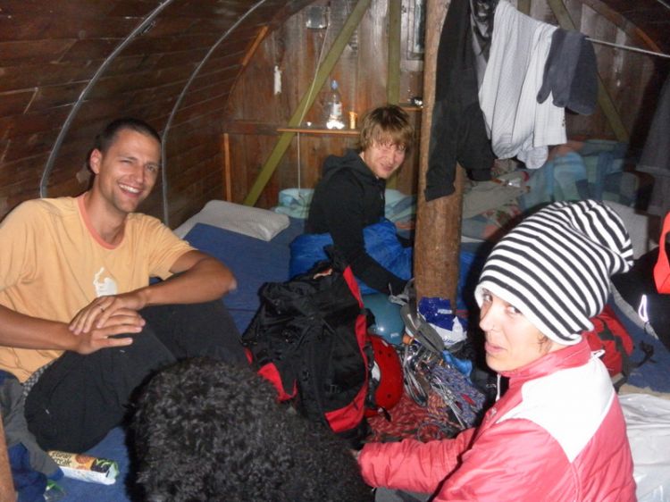 Ker je v Belih vodah zvečer še deževalo, smo šli na pot bolj pozno in do bivaka prispeli ob enih ponoči. V bivaku so blazine in deke, spalke in podloge niti ne rabiš (če seveda dobiš prostor v bivaku). Od tam je dostopa do stene kakih 5 min. Pravi luksuz! Budilke smo nastavili za ob 5h zjutraj, ker pa je izgledalo bolj turobno vreme, smo mirno začorili še eno uro, dokler se ni pokazal sonček.