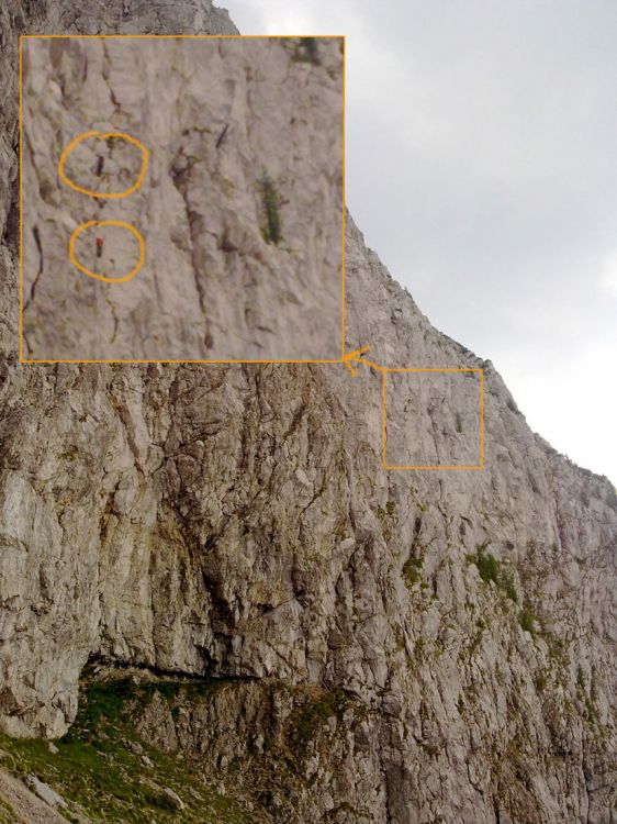 Še druga naveza v isti smeri. Če bi bil boljši fotkič bi se morda tudi kaj videlo (Gašper varuje soplezalca med plezanjem prvega dela plošče)