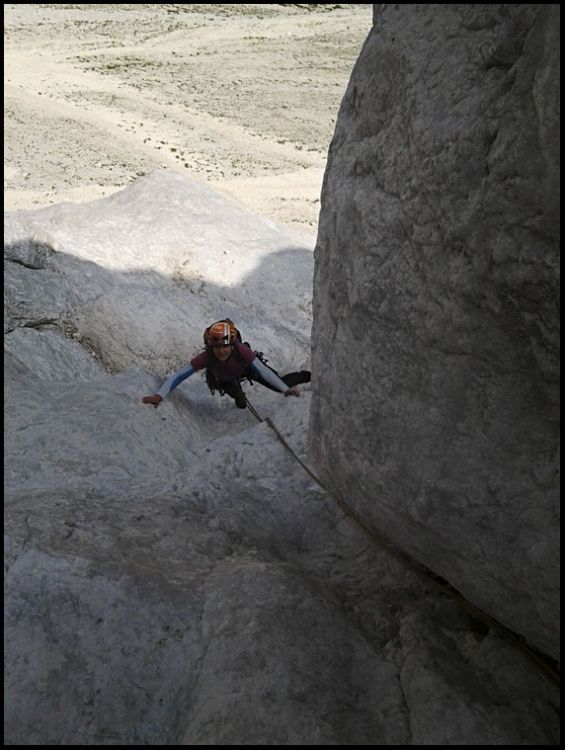 Po vstopnih kaminih ju pričakajo strmi sprani žlebovi in plate z mikro ozirom kar nano-stopki.