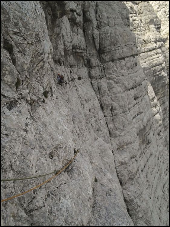 Slikovito prečenje v levo ju pripelje pod sistem zajed in stebrov, kjer se smer razcepi v dve varianti.