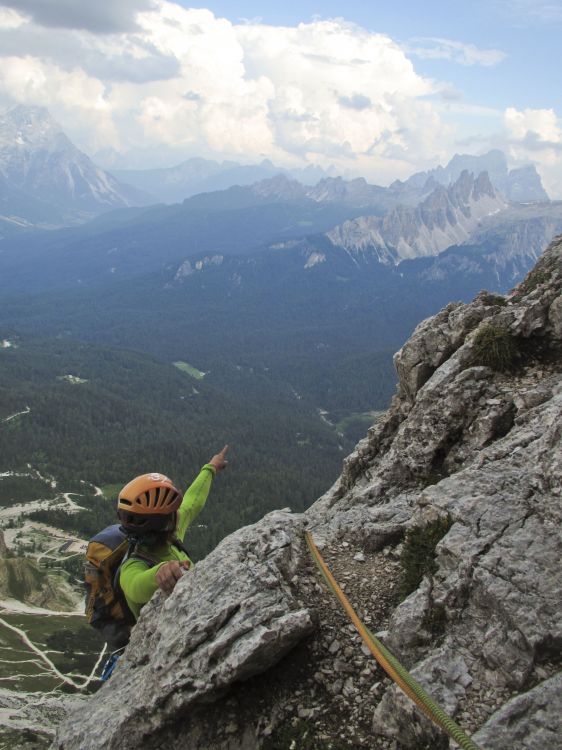 Nekoliko višje pa že izbirava steno za naslednji dan. Pozorno oko bo tu opazilo, da ČAO punce vedno pazijo tudi na barvno usklajenost štrikov, oblačil, vponk … Ko bi le videli, kako je bilo šele dan kasneje, ko smo bile v Cinque torri na kupu 4 ČAO babnice… kombiniranje matičark, pa gurten… samo zato, da je bil štant tudi lep