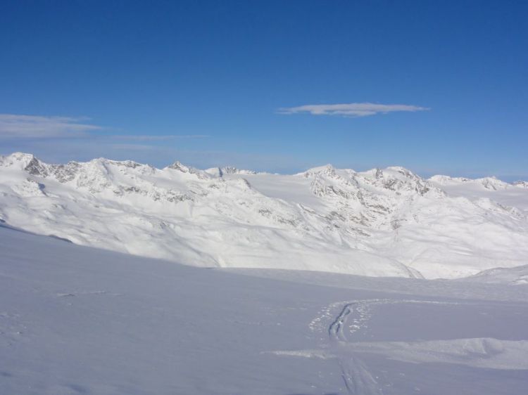 Spust po kložastem in položnem ledeniku ni bil presežek, bolj napeto je bilo iskanje prehodov po njegovem robu v dolino, na koncu nas je čakal še krajši vzpon in nato spust po pistah v meglo....