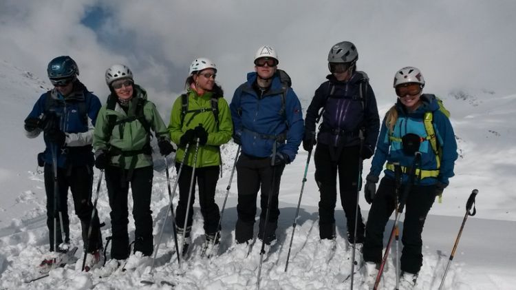 Naš prvi osvojeni cilj. O smučariji navzdol sploh ne bom izgubljal besed, povem lahko samo, da smo pod vršnim klancem še enkrat nataknili pse na smuči in še enkrat na vrh, ker bi bilo škoda tak pršič in tako pobočje puščati za druge.