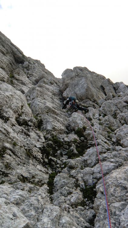 Plezala sva izmenično, vsak po cca tri cuge naenkrat. Se je kar obneslo, glede na kratke raztežaje.