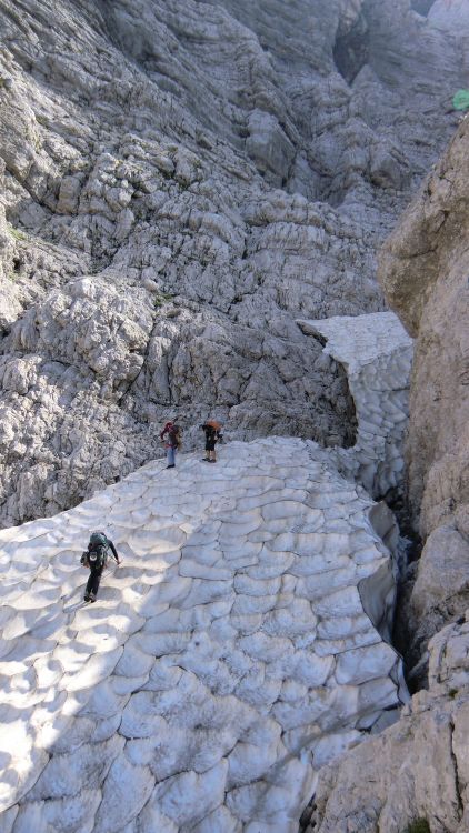 Iz Bavarske proti izstopu Zimmer-Jahn je teba prečiti Nemško grapo, kjer je še kar nekaj snega. Na srečo je bil že dovolj zmehčan, tako da gre v roke vzameš kladivo in klin, pa gre.