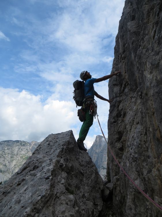 Prvi dan sva ves čas plezala kar v treking copatih, le na dveh do treh mestih sva se preobula v plezalke. To je že eno tako mesto, katerega sva zaradi varnosti raje plezala v plezalkah.