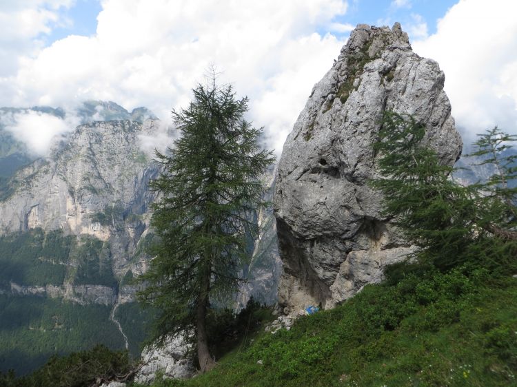 Pod temle balvanom je še en prostorček za možno bivakiranje. Če dobro pogledaš vidiš nekaj modrega - že pripravljene ležalke za utrujene plezalce