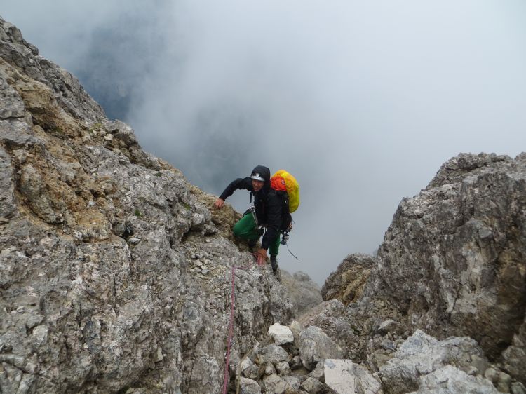 Ura je bila 15.00, ko sva izplezala iz stene. Prej ni šlo, saj sva nekaj časa zopet preždela pod najinim Storm shelterjem. Ko se je nevihta malo umirila sva plezala naprej, pa čeprav mokra.