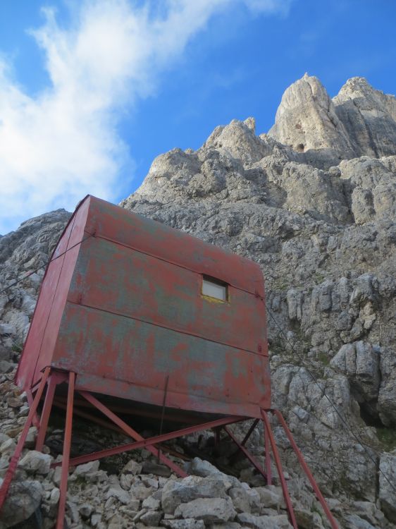 Bivak Biasin pod Monte Agnerjem. Ker se je zjasnilo, sva se odločila, da sestopiva kar v dolino do koče Scarpa, kjer sva ta dan prespala.