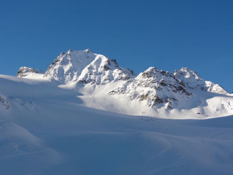 Spet na ledeniku Jamtal Ferner - tokrat proti desnemu vrhu - Dreiländerspitze 3179 m, ki je kakopak na meji treh dežel: dveh avstrijskih - Tirolske in Vorarlberga ter Švice (Graubünden)