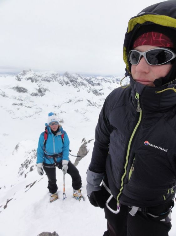 Smo z Alenko in Janjo kar na predvrhu počakali naskočno navezo v izogib drenjanju in jahanju grebena- se hitro razvadiš in ne rineš vedno do konca. Aha, punci tokrat ne predeta!