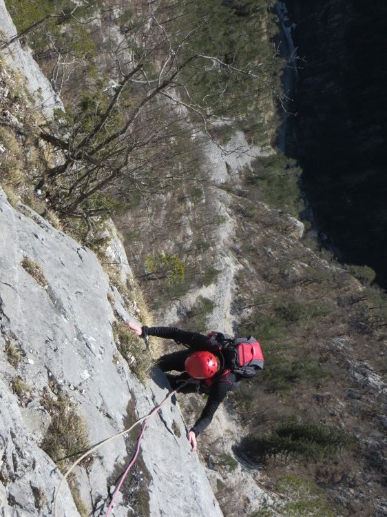 Nad poraščenim delom smeri, kjer je Jurij izkoristil tudi drevesa za izdelavo varovanja